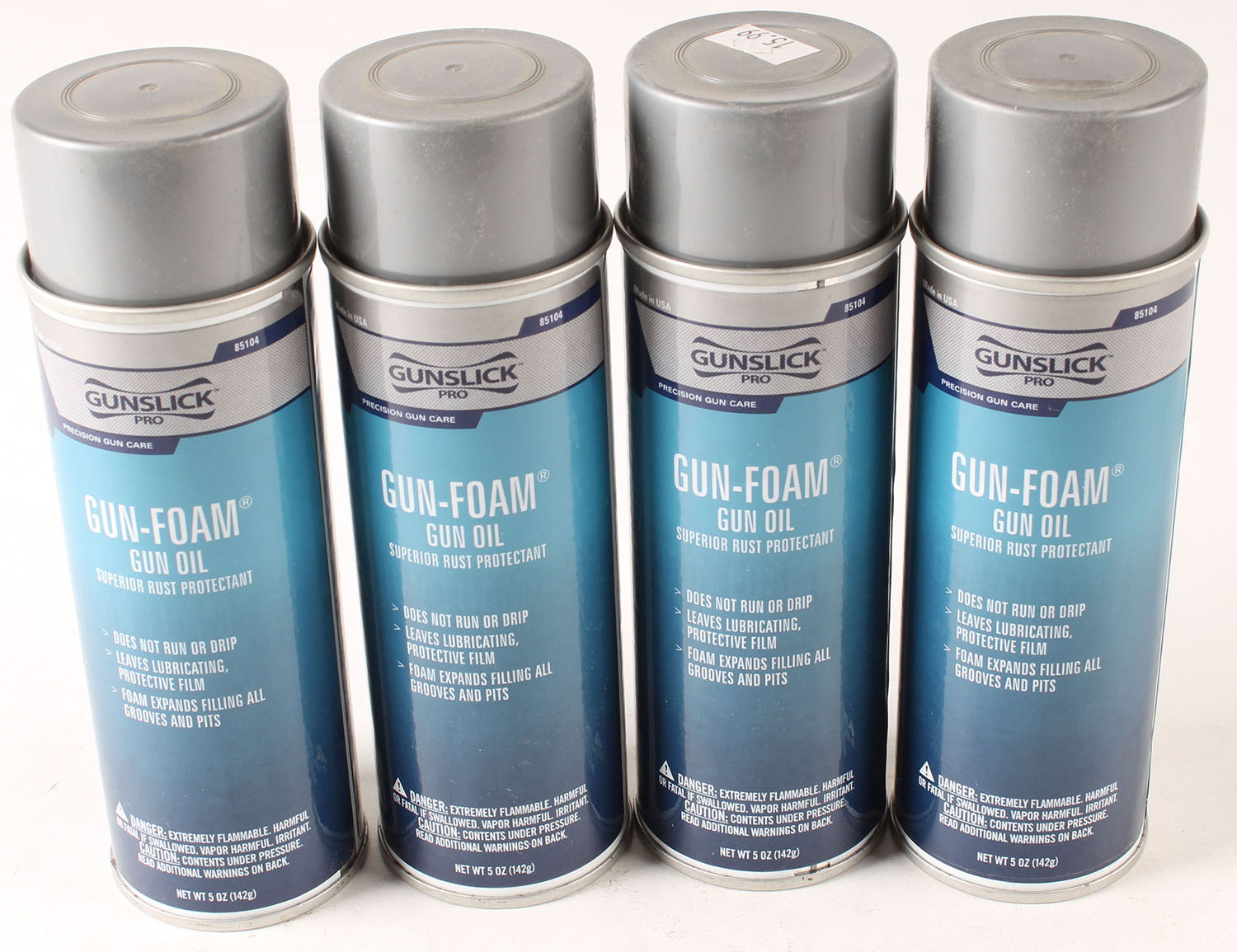 Lot of 4 Gunslick Gun Foam Gun Oil spray cans. Grade: MINT - Value: 10 to 60