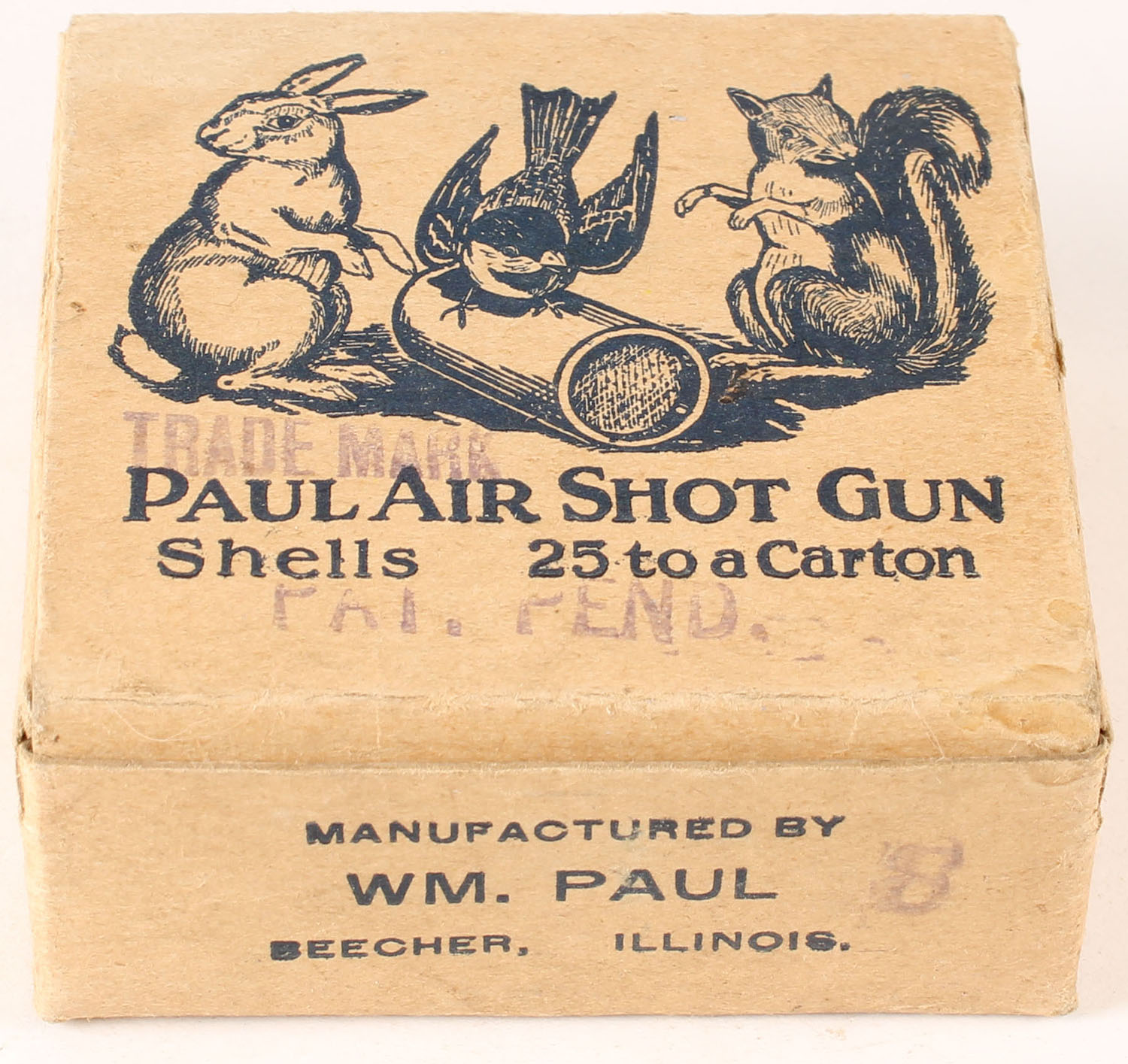 Paul Air Shot Gun Shells, 25 to a carton, pictures small game on front, almost full, Pat. Pend. Grade: Excellent - Value: 20 to 200