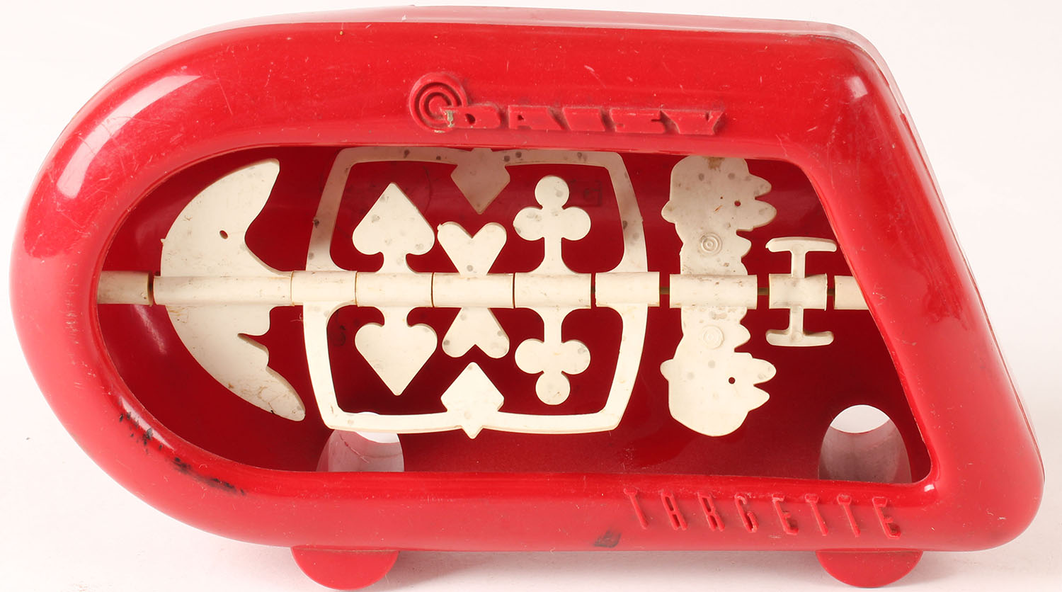 Daisy BB Gun Targette counter display, red & white plastic, the targets rotates when you hit target, the container collects the BB's, 8 1/2'' wide. Grade: Excellent - Value: 10 to 70