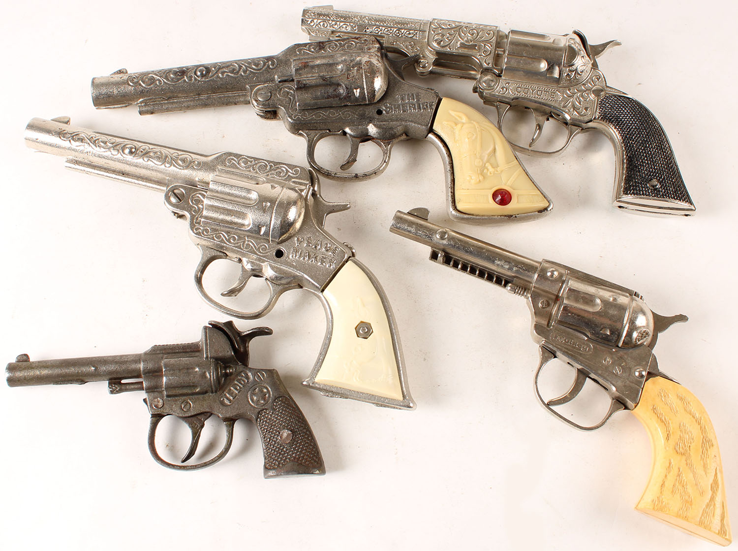 Lot of 5 Vintage Cap pistols, marked The Sheriff, Hubley, Teddy, Coyote, Peace Maker. Grade: Excellent - Value: 20 to 150