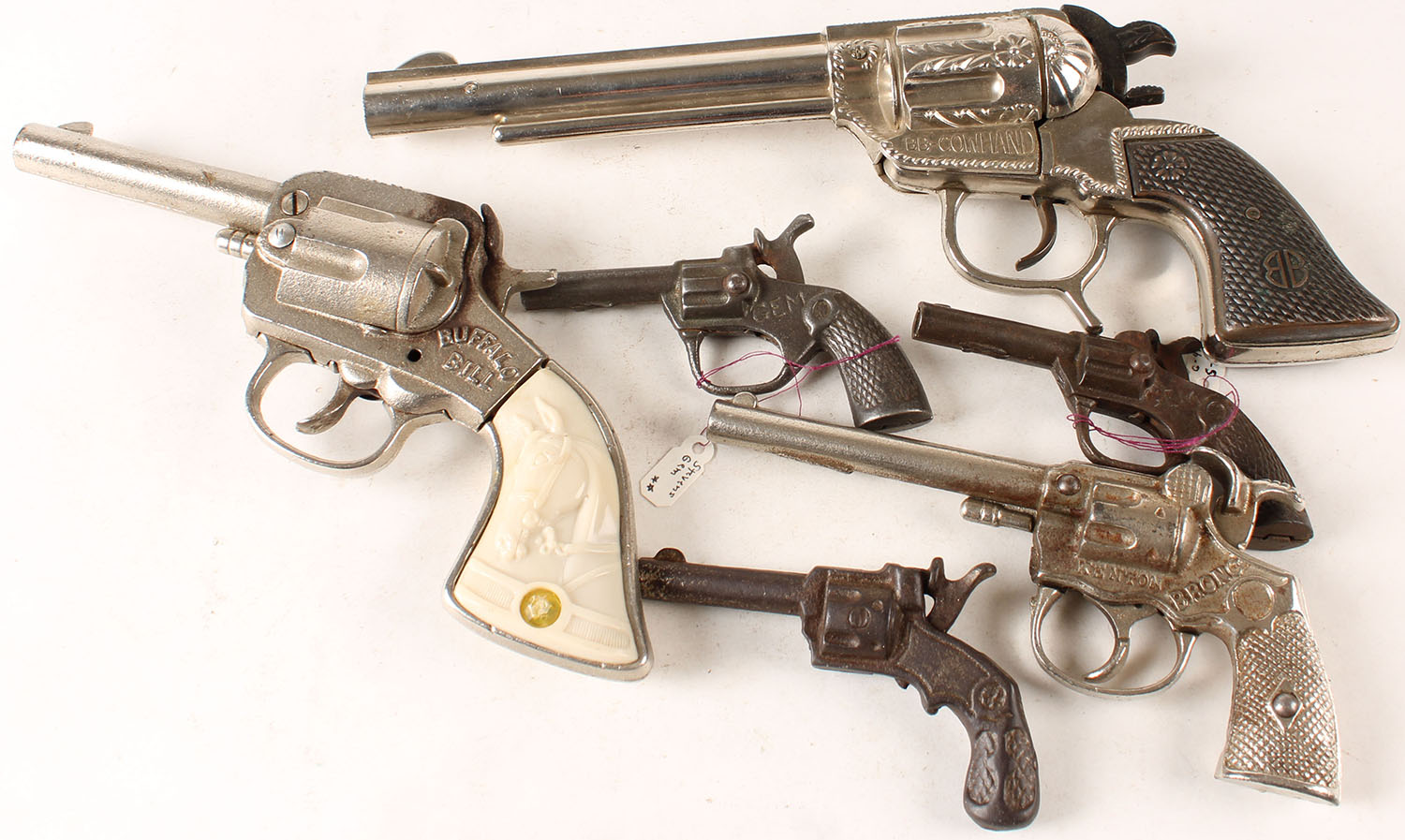 Lot of 6 Vintage Cap pistols, marked Buck'n Bronc BB Cowhand, Buffalo Bill, Bronc Kenton, GEM, GEM, unmarked. Grade: Very Good - Value: 10 to 150