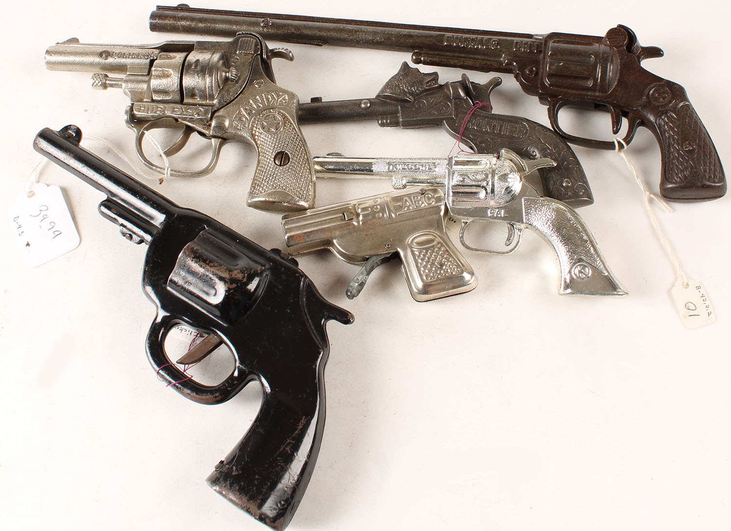Lot of 6 Vintage Cap pistols, marked Frontier (RARE), Hubley Dandy, Buffalo Bill, ABC, Kilgore, unmarked. Grade: Very Good - Value: 100 to 300
