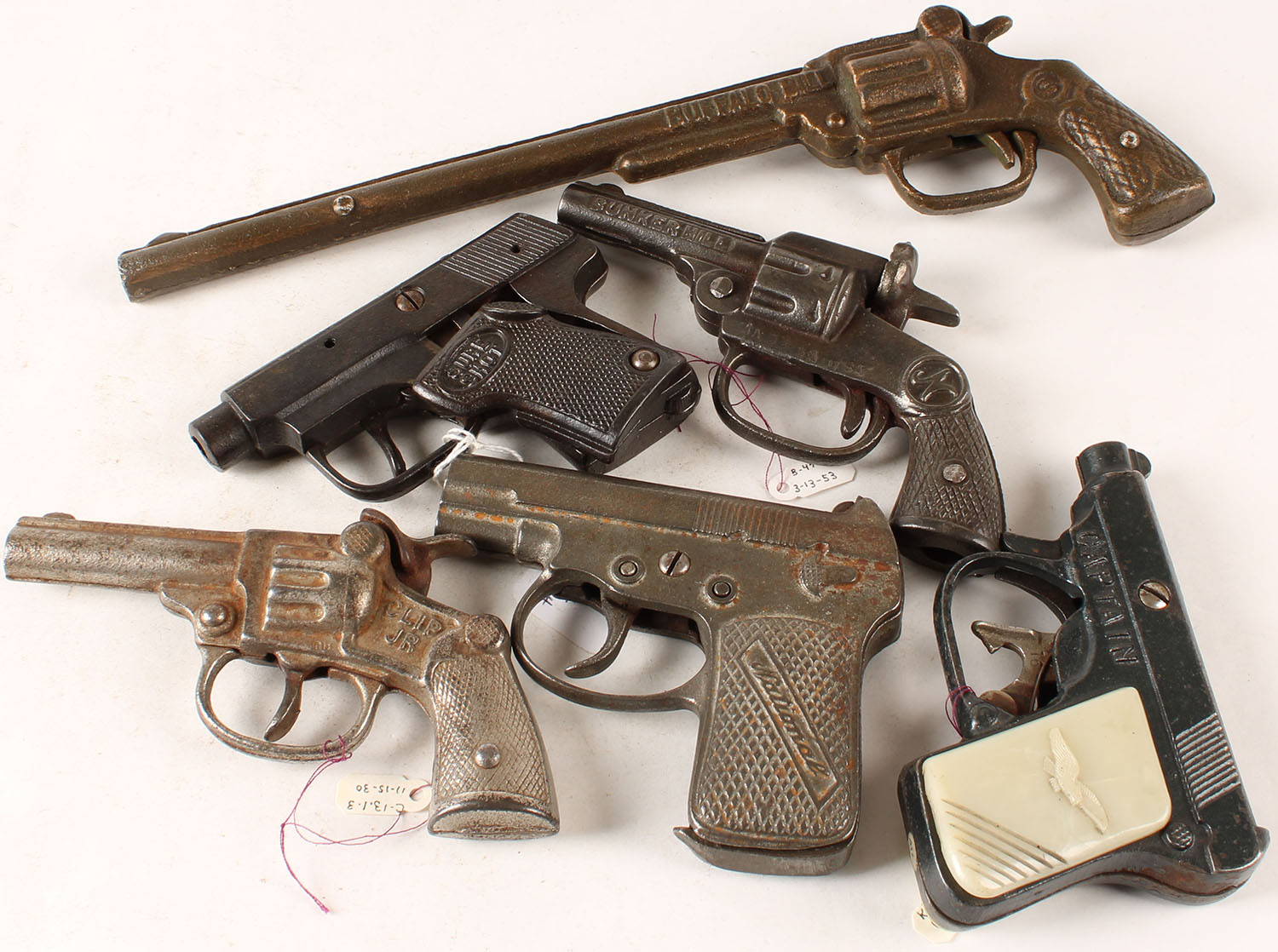 Lot of 6 Vintage Cap pistols, marked Captain, Clip Jr, Sure Shot, National Bunker Hill, National, Buffalo Bill S W. Grade: Very Good - Value: 20 to 200