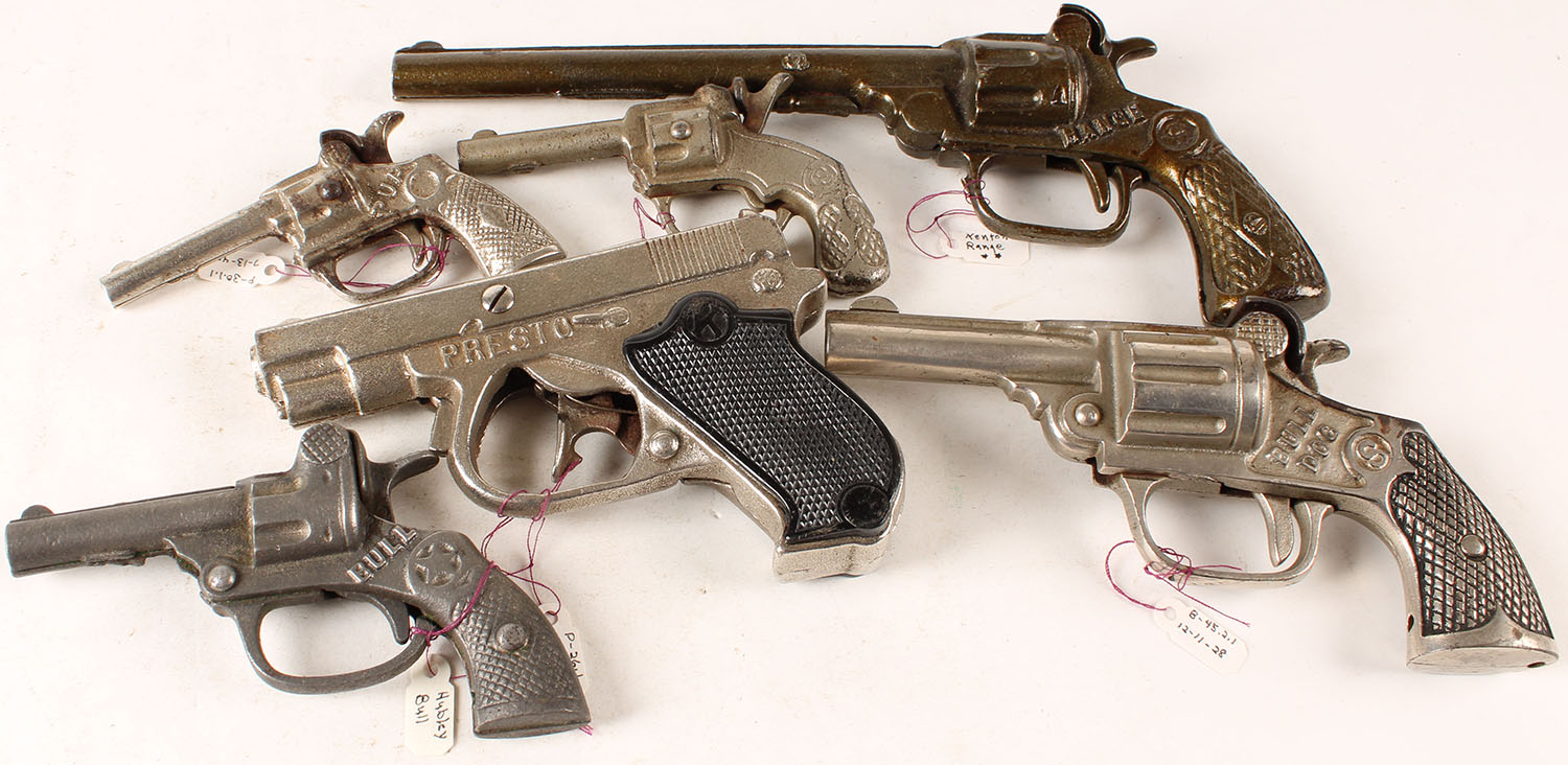Lot of 6 Vintage Cap pistols, marked Bull Dog, Range S W, Bull, Presto, S W, Pup. Grade: Very Good - Value: 10 to 150