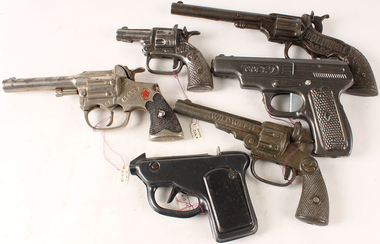 Lot of 6 Vintage Cap pistols, marked Stevens Columbia (Rare), Hubley Cub, Hubley Derby, National Wild West, Colt 7 Cork Gun, Acme. Grade: Very Good - Value: 50 to 300