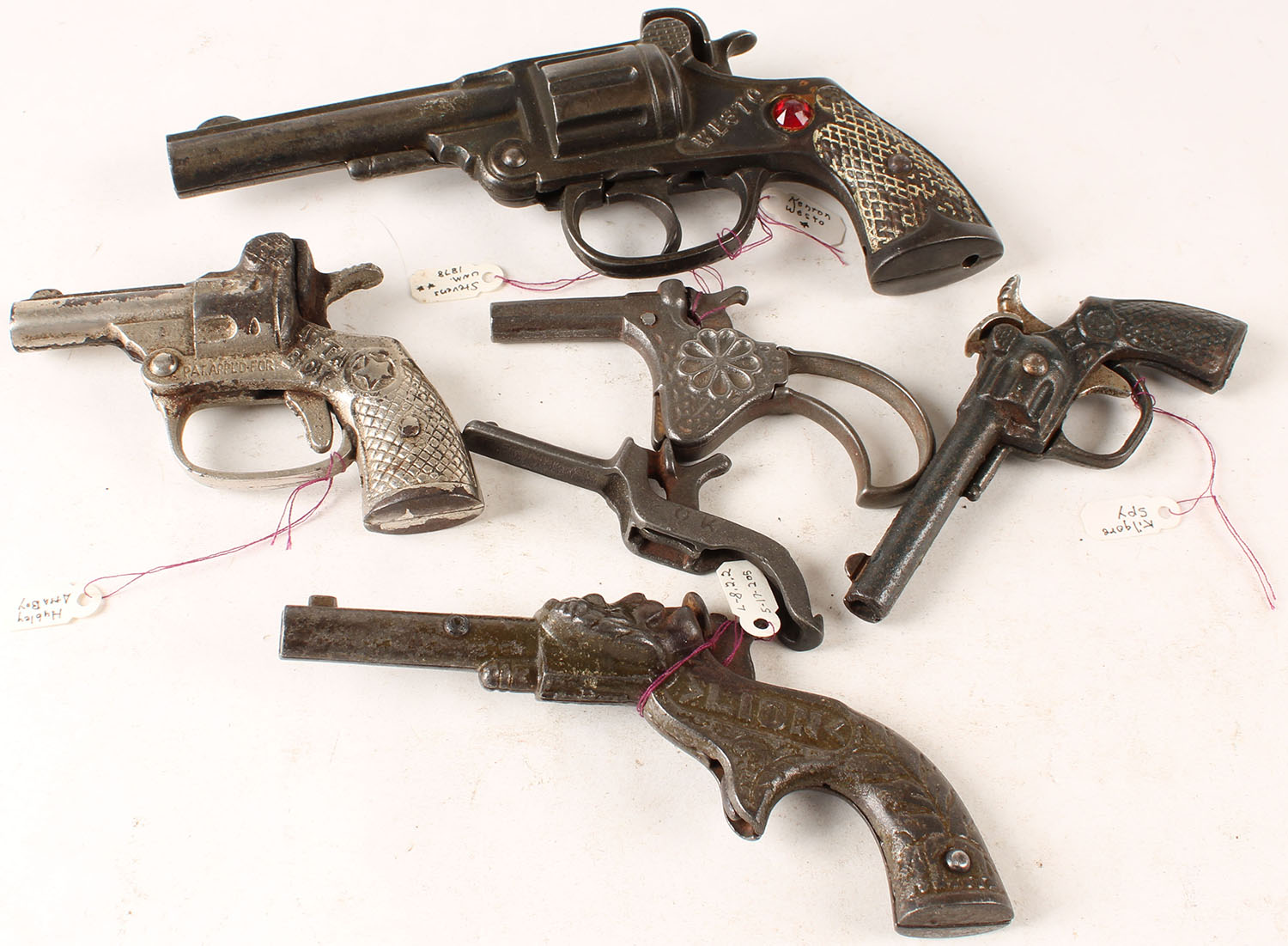Lot of 6 Vintage Cap pistols, marked Kenton Westo, Kilgore Spy, Stevens Lion, Stevens Unknown, Hubley Atta Boy, OK. Grade: Very Good - Value: 50 to 200