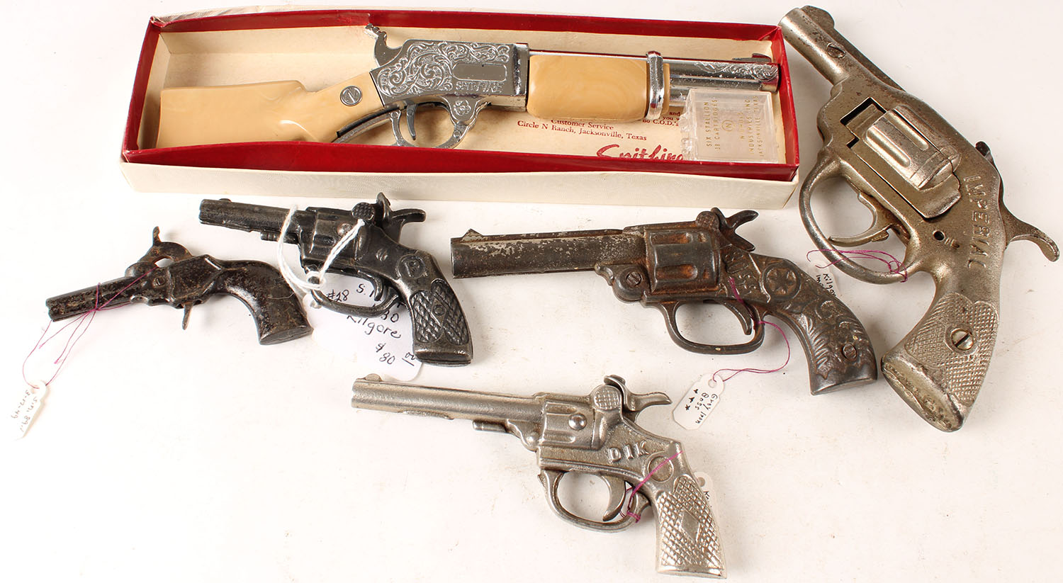 Lot of 6 Vintage Cap pistols, marked Nichols Spitfire cap gun in box, Kilgore P, Kenton Dik, Boss, Kilgore Imperial, unmarked. Grade: Very Good - Value: 50 to 250