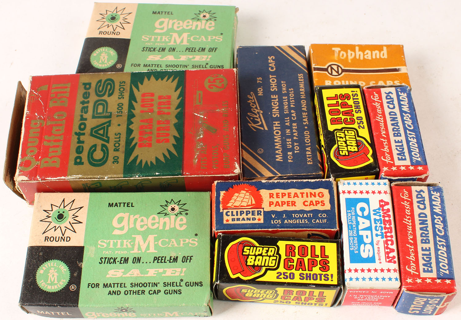Lot of Early Caps in original colorful boxes, most are full. Grade: Excellent - Value: 10 to 50