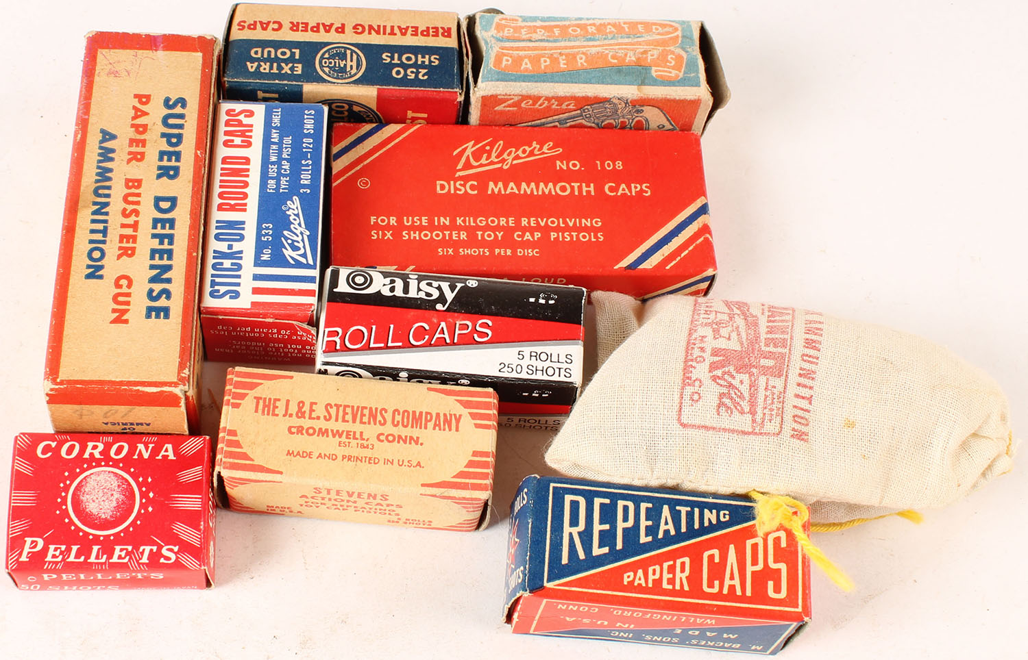 Lot of Early Caps in original colorful boxes, most are full. Grade: Excellent - Value: 10 to 50