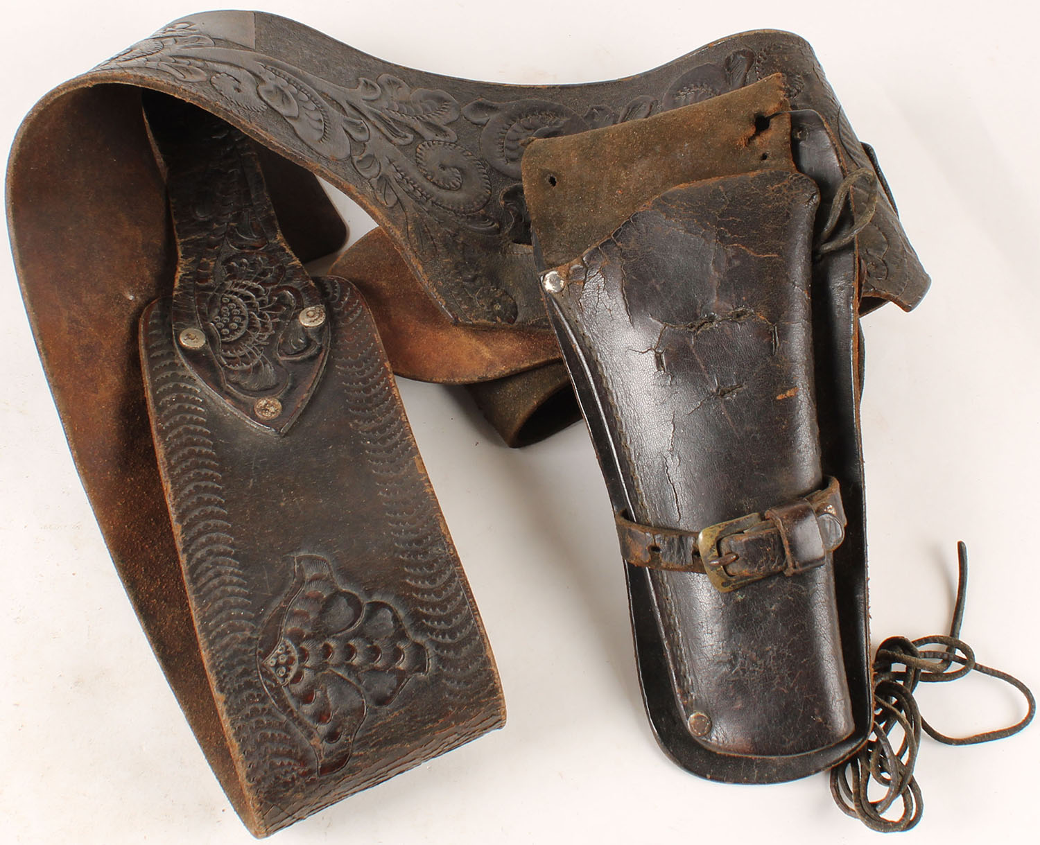 Early wide leather belt with holster, unmarked with tooling. Grade: Very Good - Value: 4 to 50