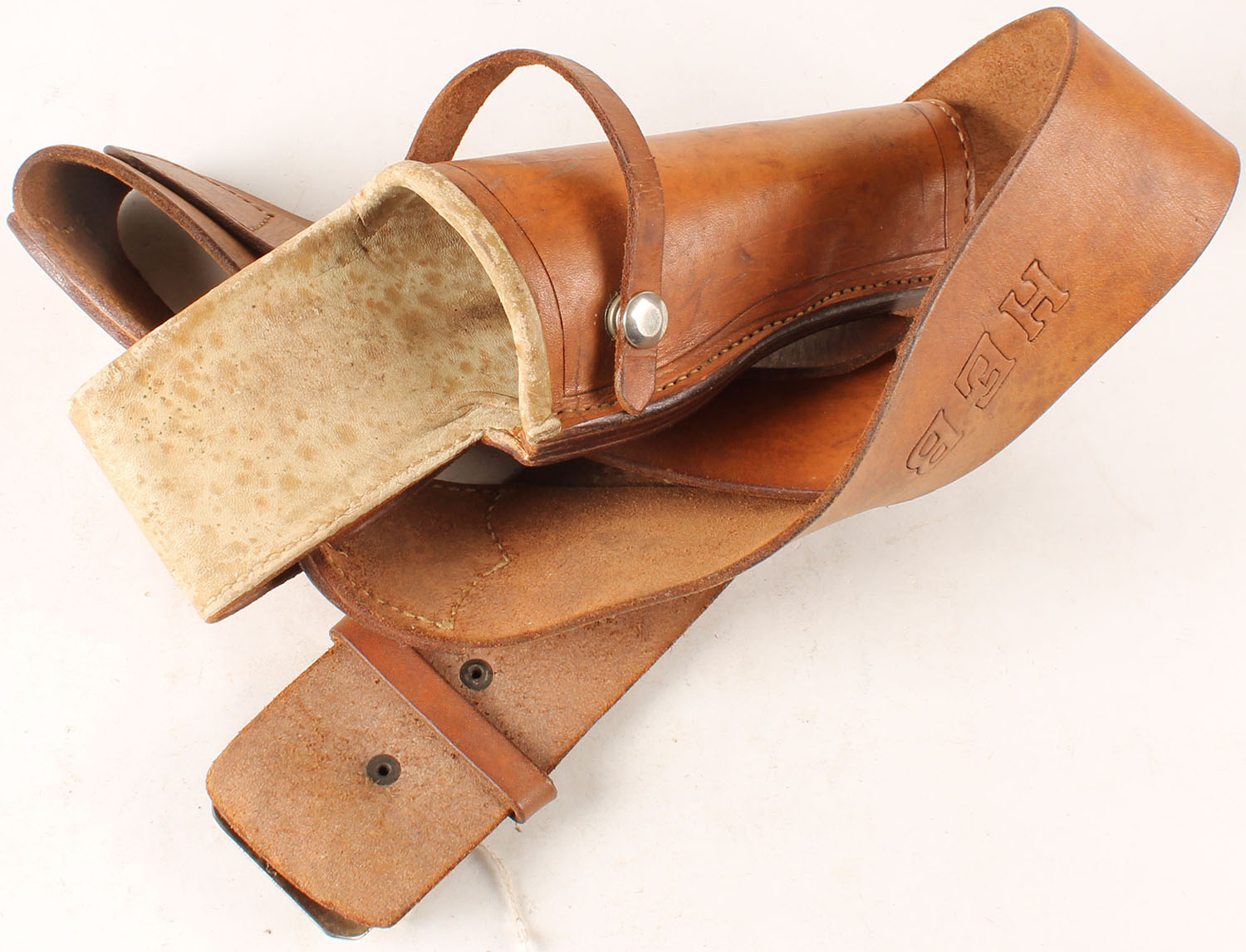 Early wide leather belt with holster, marked HEB. Grade: Excellent - Value: 4 to 50