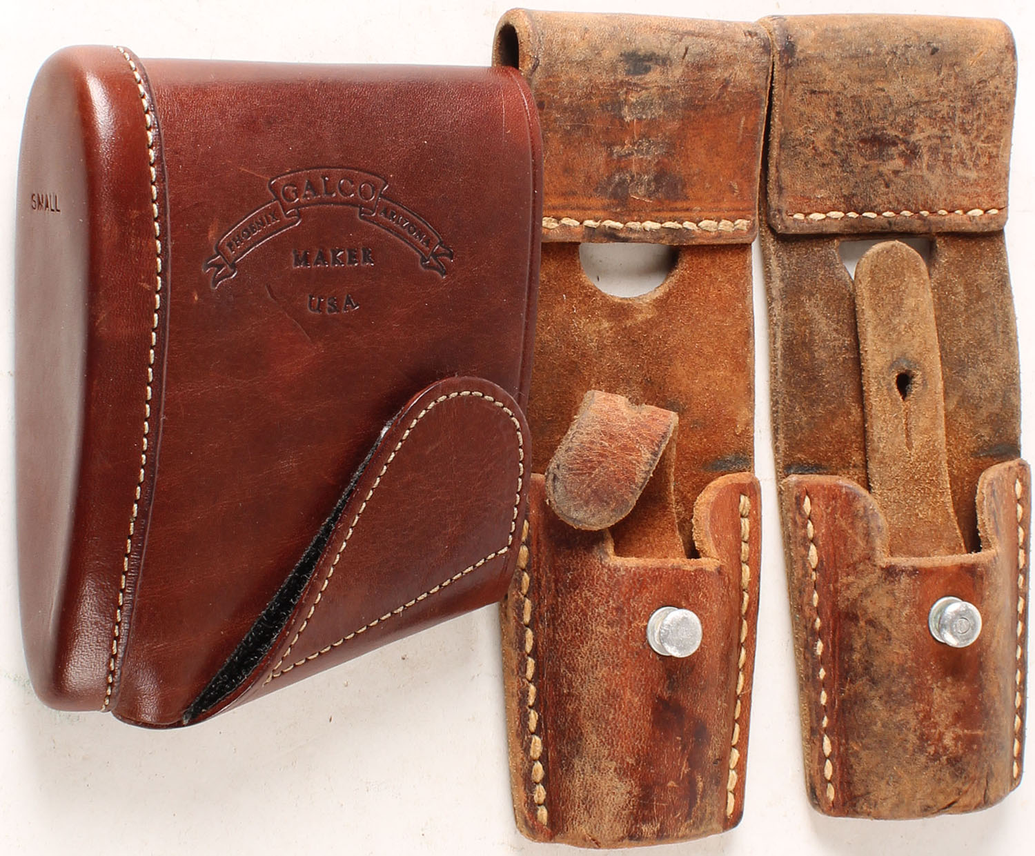 Lot of 3 leather items, on Galco leather butt pad is mint & two bayonet frogs. Grade: Very Good ++ - Value: 10 to 100