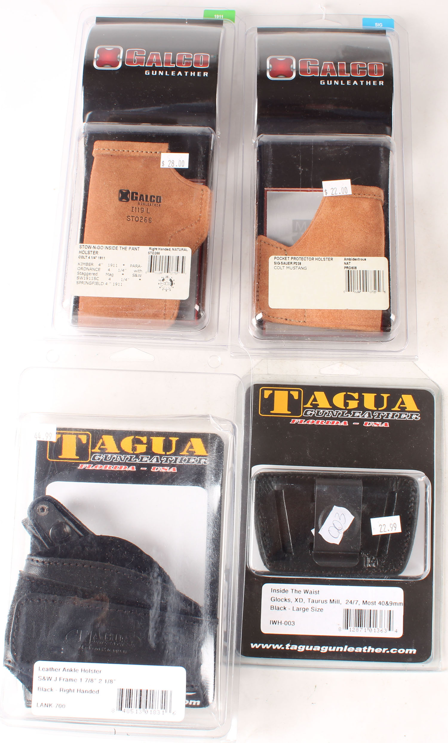 Lot of NIB pistol holsters in the original packaging, see photo for more details. Grade: MINT - Value: 20 to 80