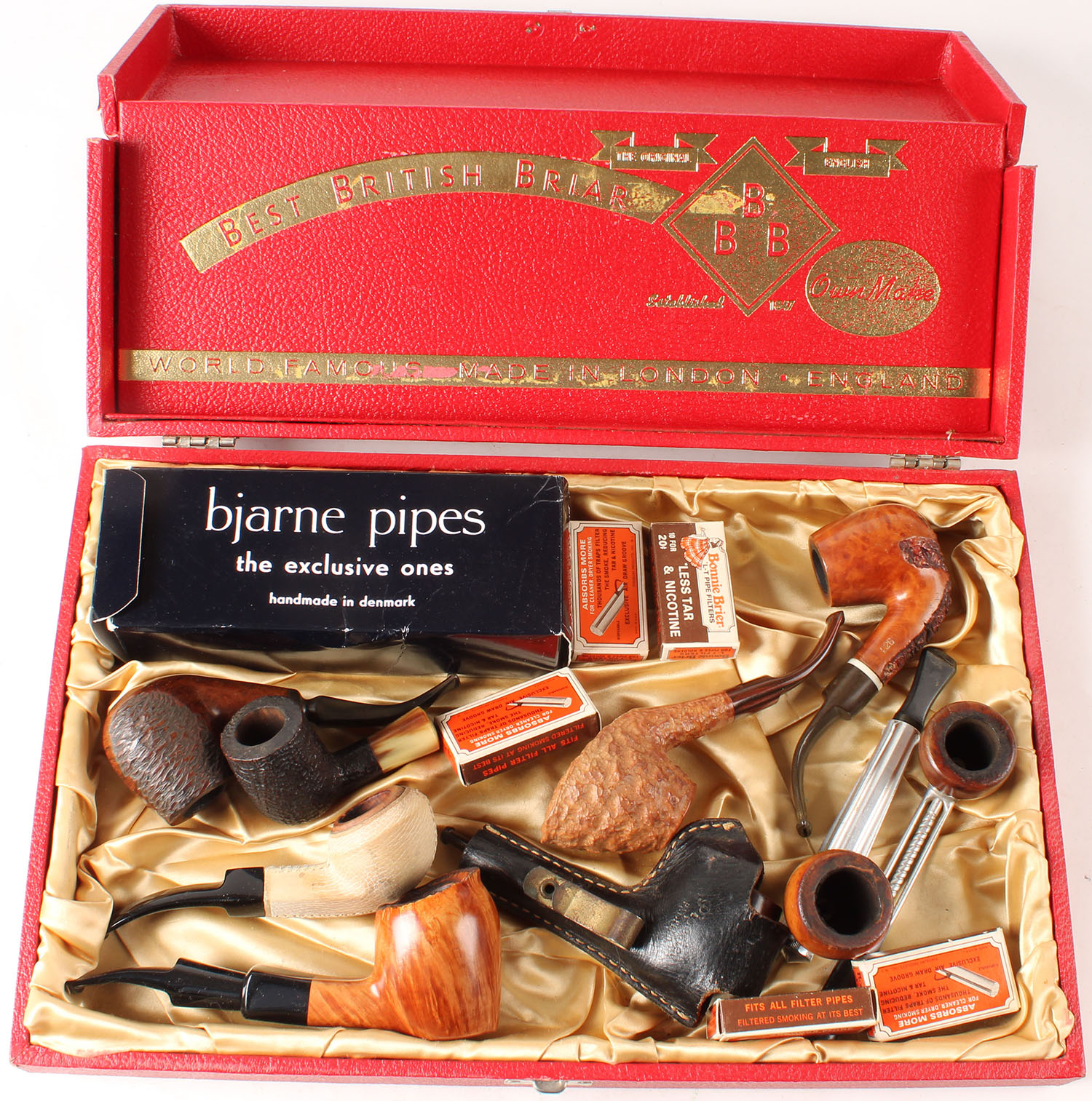 Lot of 10 Tobacco Pipes in Best British Briar display case, 16'' wide. Grade: Excellent - Value: 50 to 350