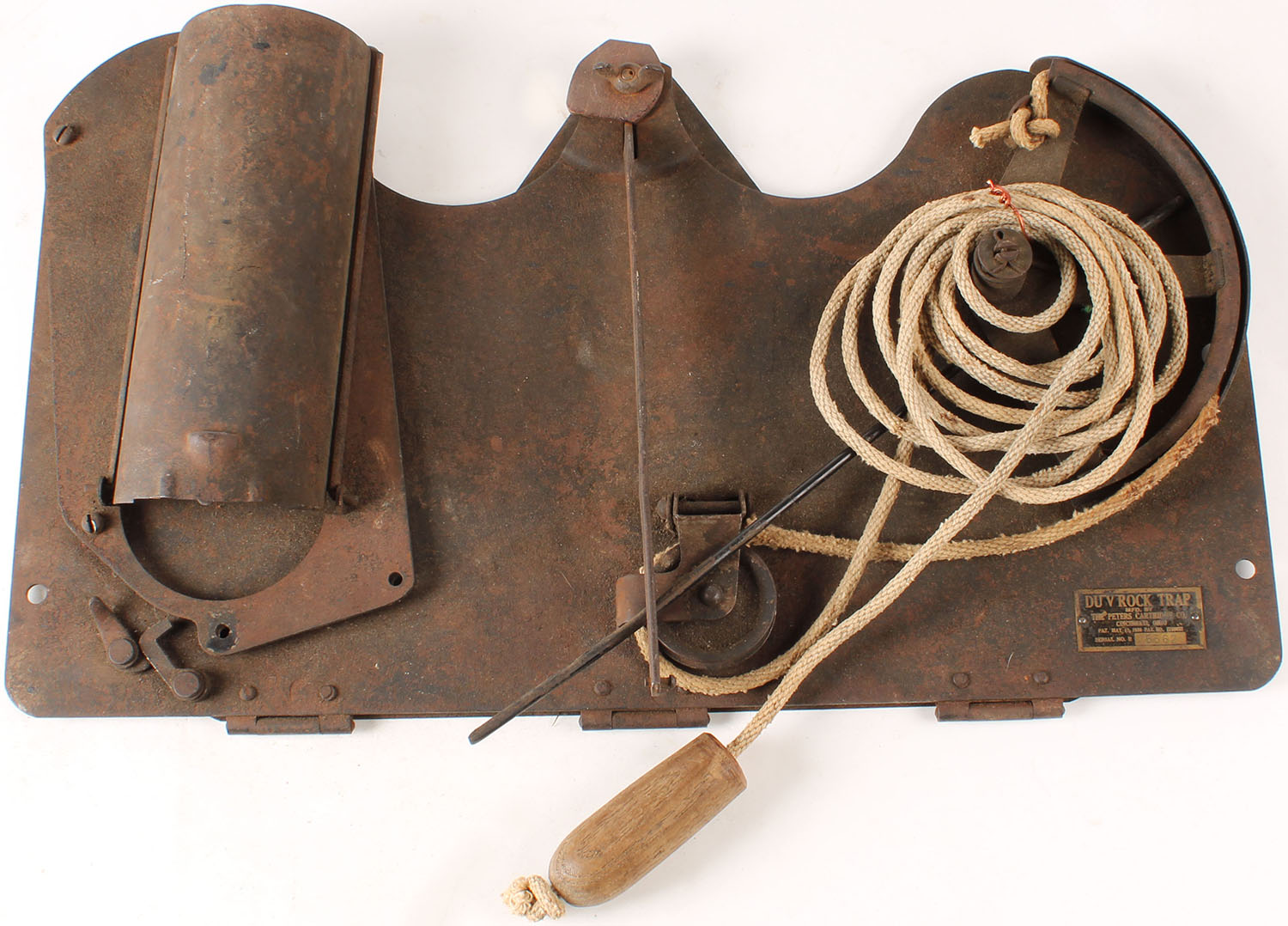 RARE! Peters Cart. Co Duv Rock Trap Thrower, # 5562, circa 1930s, has rust and age soiling, 20'' x 12''. Grade: Very Good ++ - Value: 100 to 400