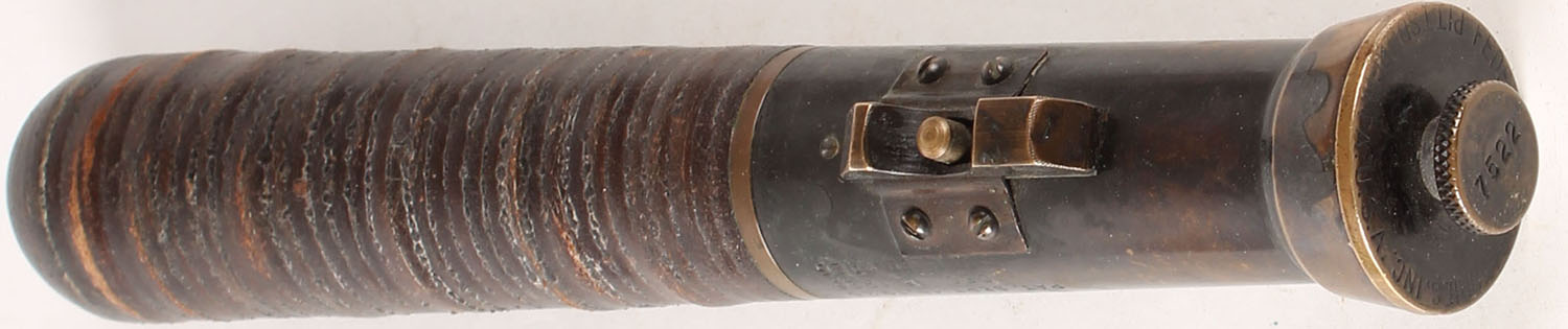 Federal Labritoires Inc. Pittsburn PA Billy Club, No 7522, administers Tear Gas, original battery operated, all brass with leather wrap, 8 1/2'' long. Grade: Very Good - Value: 50 to 300