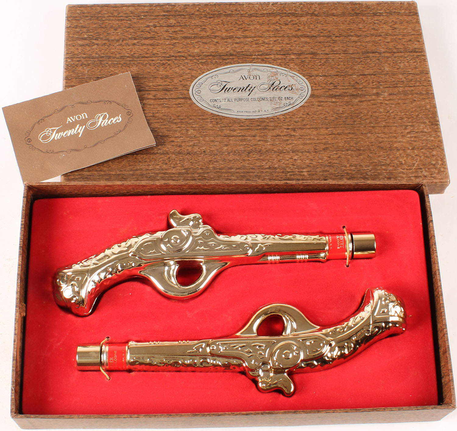 Avon dueling pistol set full of cologne, gold in color, original box. Grade: Excellent - Value: 6 to 30