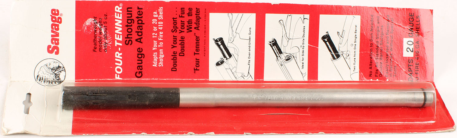 Savage Four Tenner, adapts a 12 or 20ga shotgun to a 410 ga., NIB. Grade: MINT - Value: 10 to 40