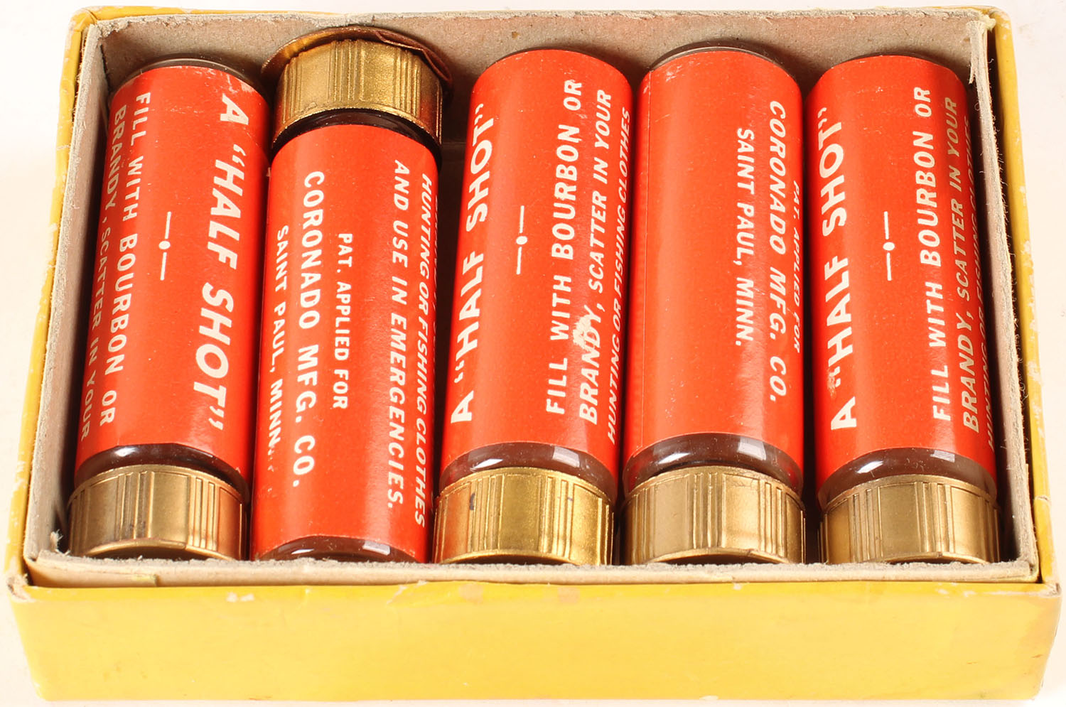 A ''HALF SHOT'', in original box, each glass vile holds a shot of whiskey, Bourbon or Brandy that you can make look like shot shell in your vest. Grade: Excellent - Value: 10 to 40