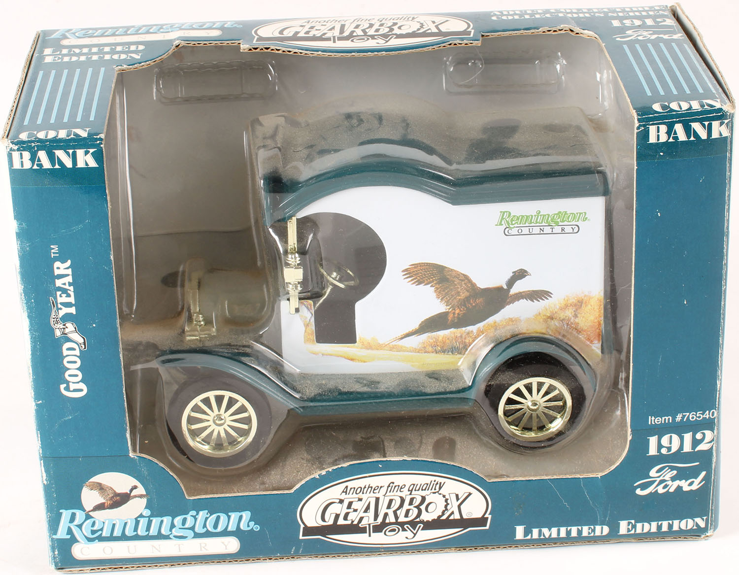 Remington Coin Bank, 1912 Ford Model T with rooster pheasant, has original box. Grade: MINT - Value: 10 to 40