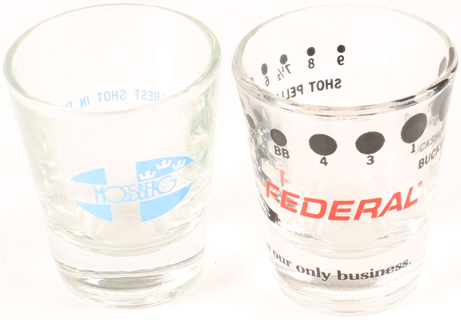 Lot of 2 Shot Glasses, Federal & Mossberg. Grade: MINT - Value: 10 to 30