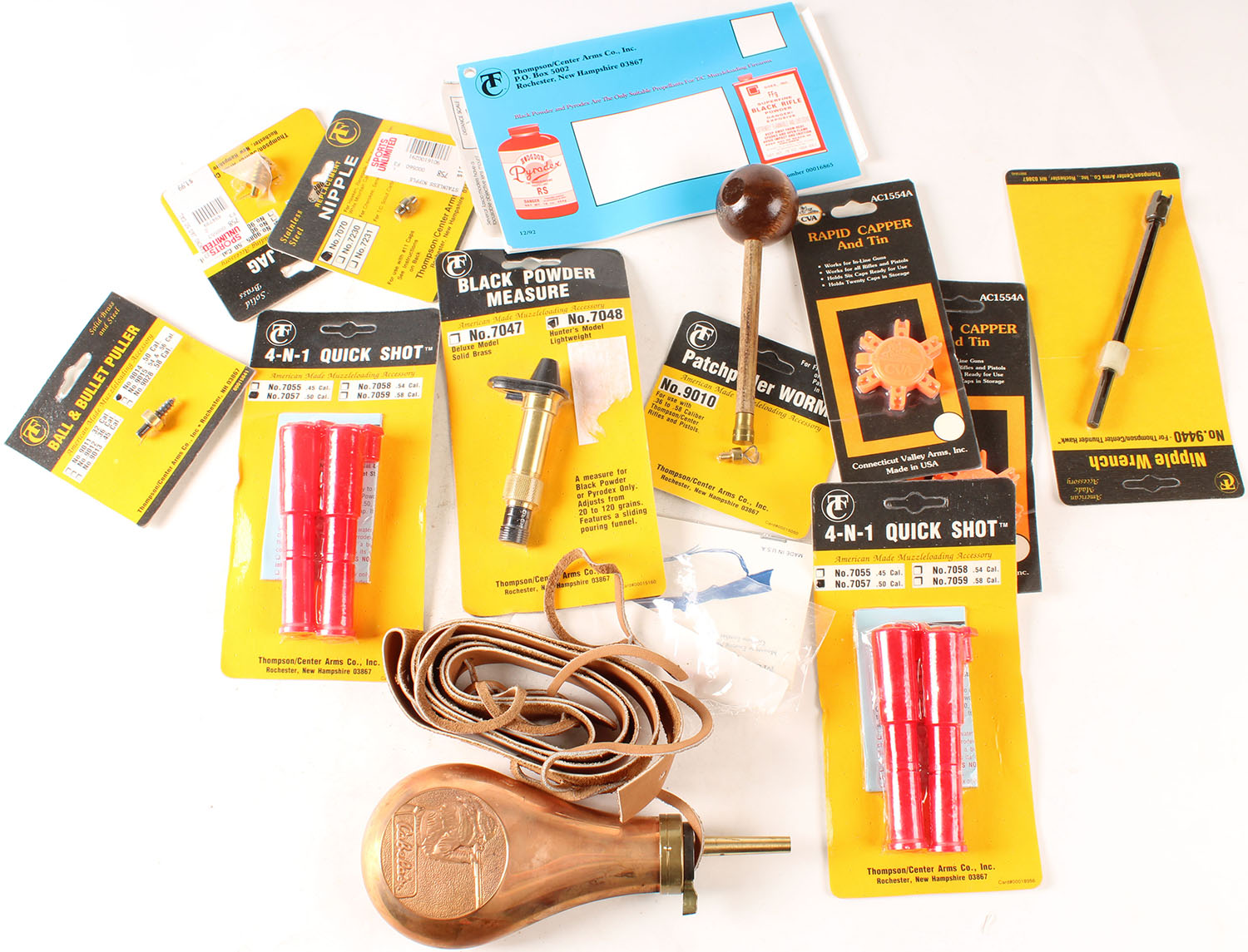 Lot of black powder items, flask, measure & many others. Grade: MINT - Value: 10 to 60