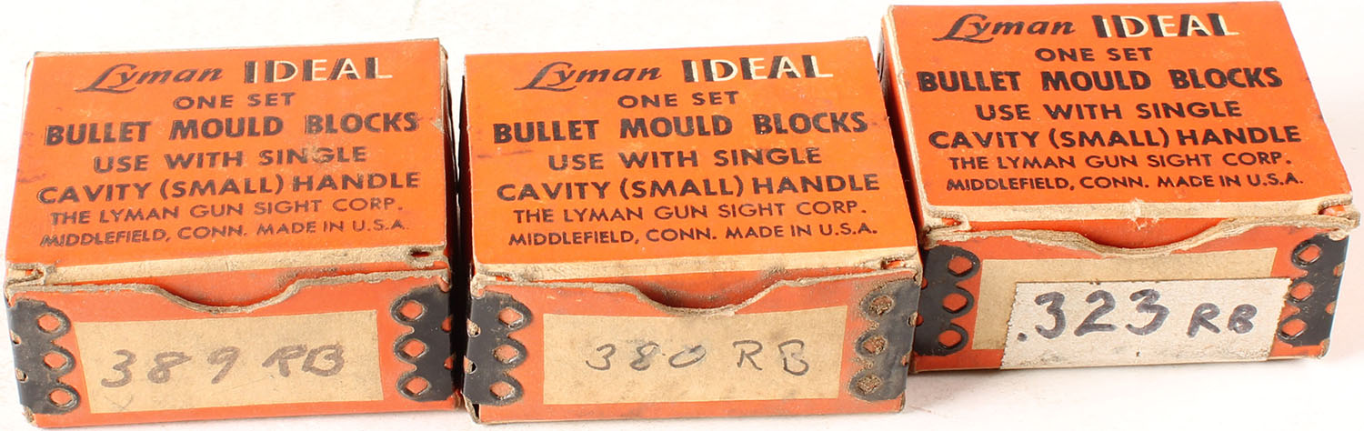 Lot of 3 Lyman Ideal bullet mould block in orignal boxes, .323, .380 and .389 cal round ball moulds. Grade: Excellent - Value: 20 to 60