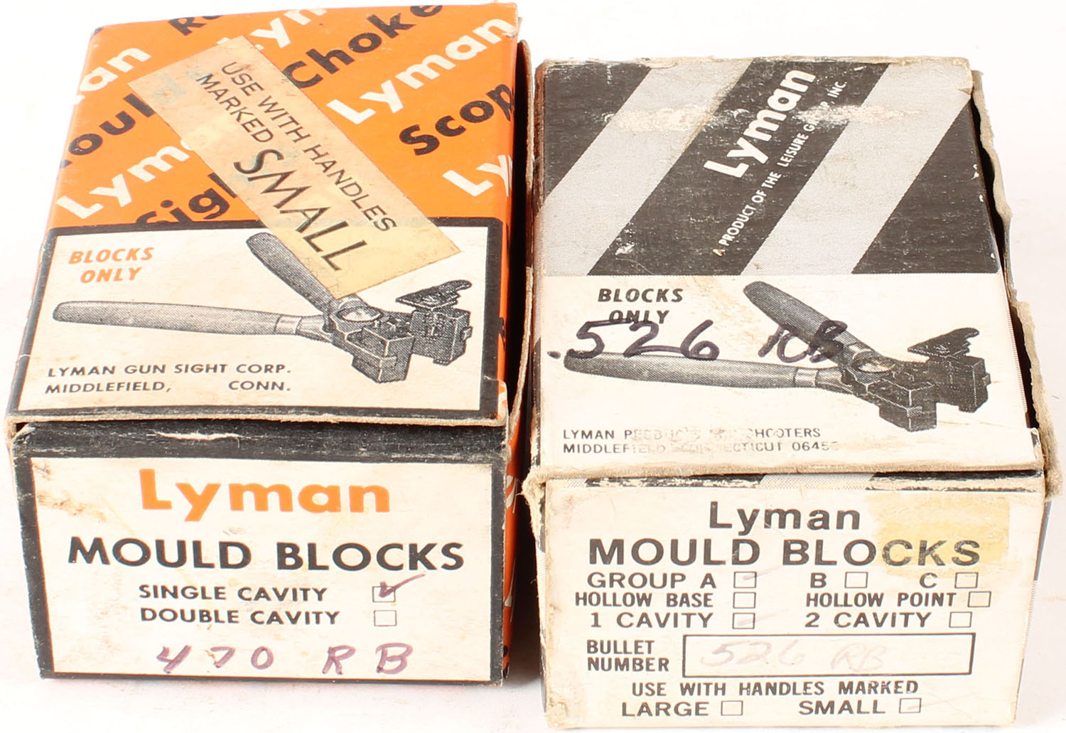 Lot of 2 Lyman Ideal bullet mould block in orignal boxes, .470 and .526 cal moulds. Grade: Excellent - Value: 16 to 50