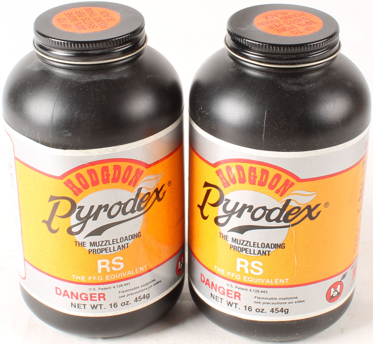 Hodgdon, Lot of (2) Pyrodex, Muzzleloading Propellant. RS - The FFG Equivalent, both bottles are full or mostly full. Grade: Excellent - Value: 20 to 100