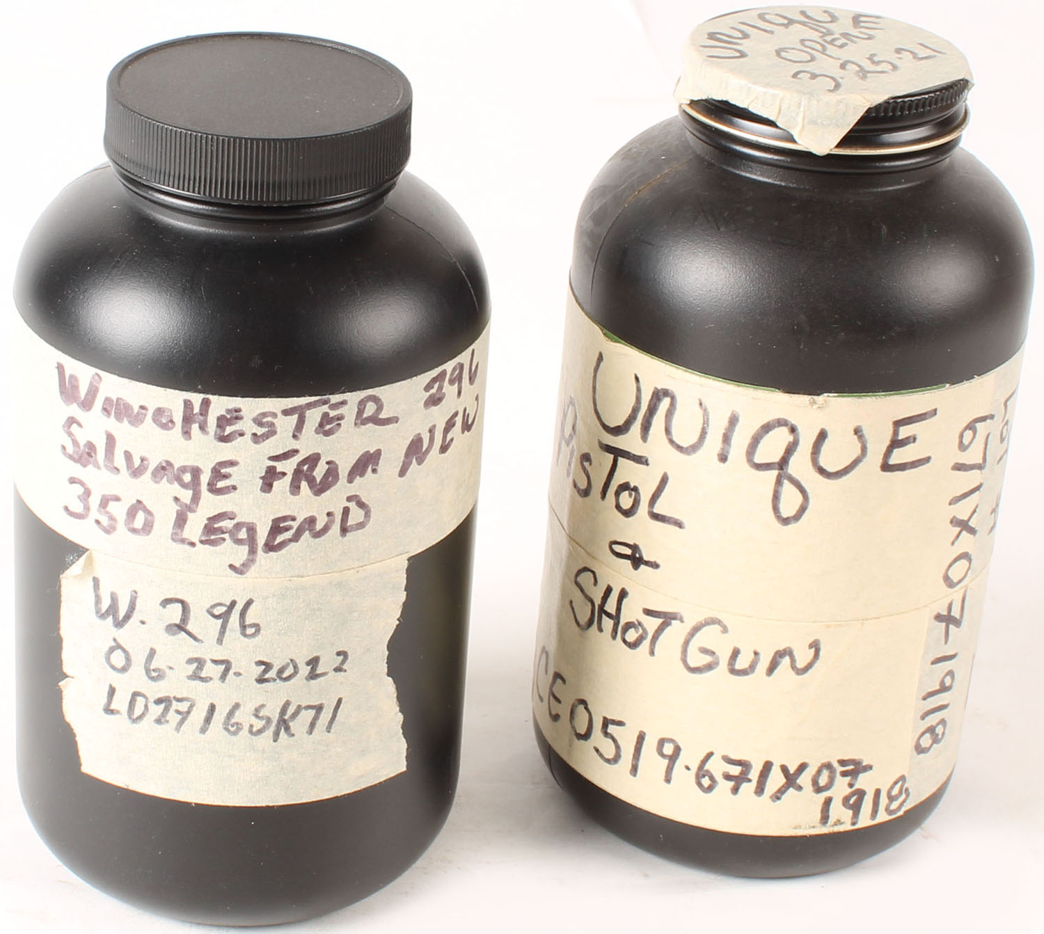 Mixed Mfg., lot of (2) powder bottles, consignor denotes that (1) is Winchester 296 salvaged from .350 Legend, & (1) is Unique Pistol & Shotgun, both bottles are full or mostly full. Grade: Good - Value: 10 to 50