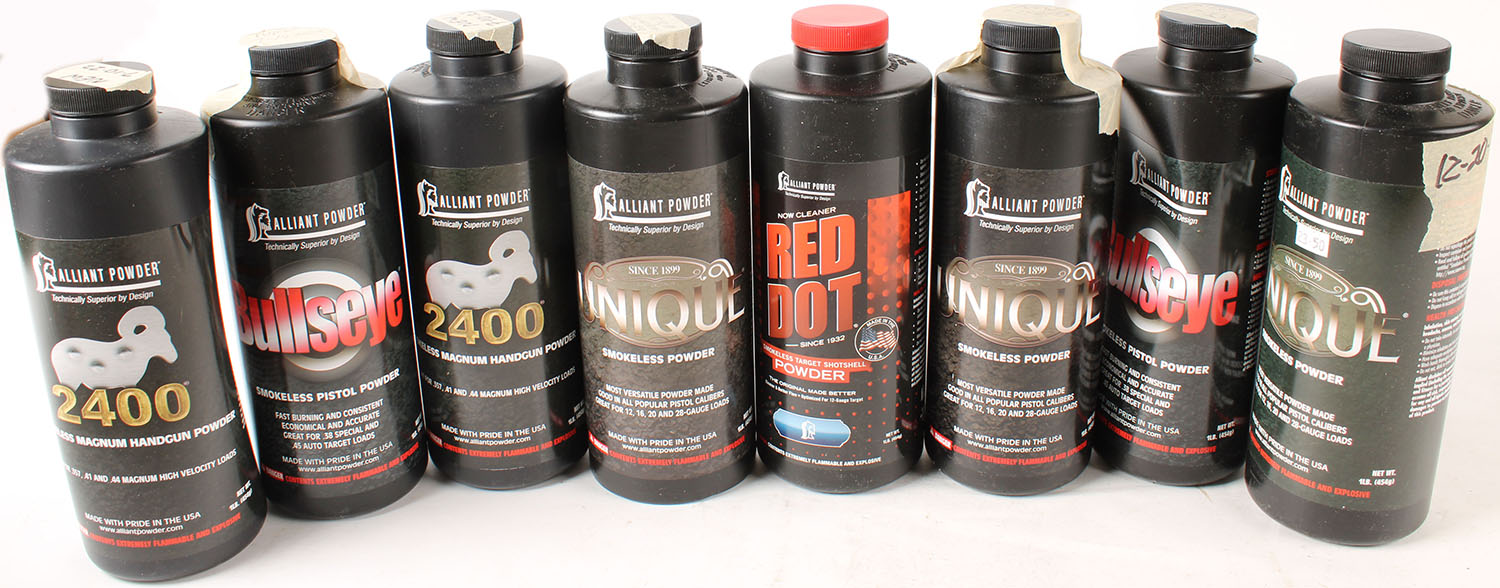 Alliant Powder, lot of (8) 1lb bottles of various powder types, all bottles are full or mostly full. Grade: Excellent - Value: 50 to 200